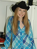 The black cowgirl hat looks quite on Skinny Mindy as she teases in her house. She's wearing delicate turquoise panties and an oversized blue top that she'll strip out of to entertain. She's also going to model the pasties on her tits that hide her nips from us.