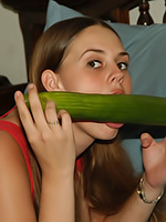 Cindy Toby is playing with cucumbers and being very suggestive. She puts one in her mouth and simulates oral for you, which is awesome. She puts another in her panties to rub it along her snatch and make it feel good. She even holds one between her legs like a dick.